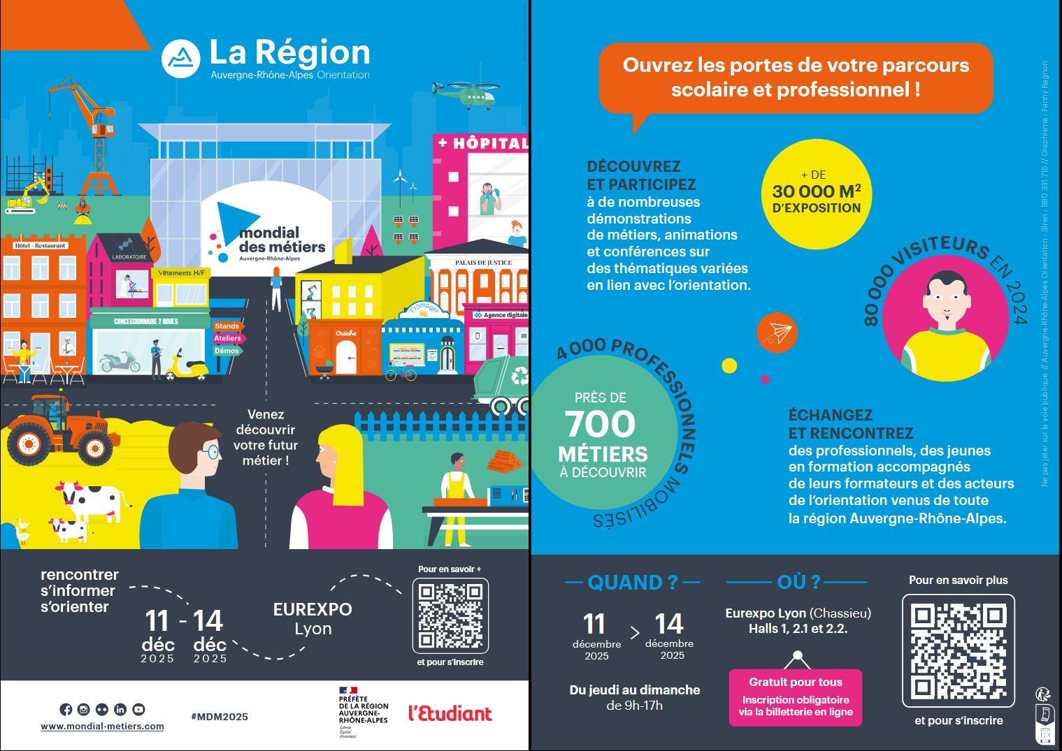 Rendez-vous du 11 au 14 décembre 2025 à Eurexpo Lyon pour construire votre projet d’orientation. L'inscription au Mondial des Métiers est gratuite et obligatoire pour tous les visiteurs : https://www.mondial-metiers.com/billetterie-en-ligne.html