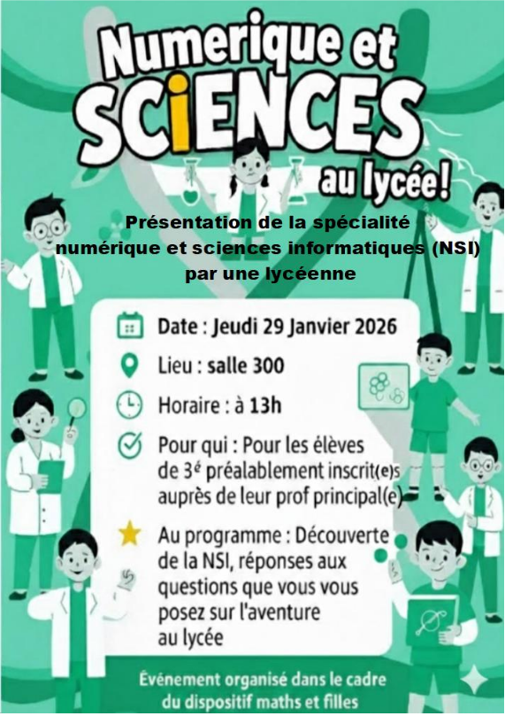 Dans le cadre du dispositif « Maths et filles », une lycéenne présentera la spécialité Numérique et Sciences informatiques le jeudi 29 janvier 2026 à 13h, salle 300, aux élèves de 3e. Inscription auprès du professeur principal.